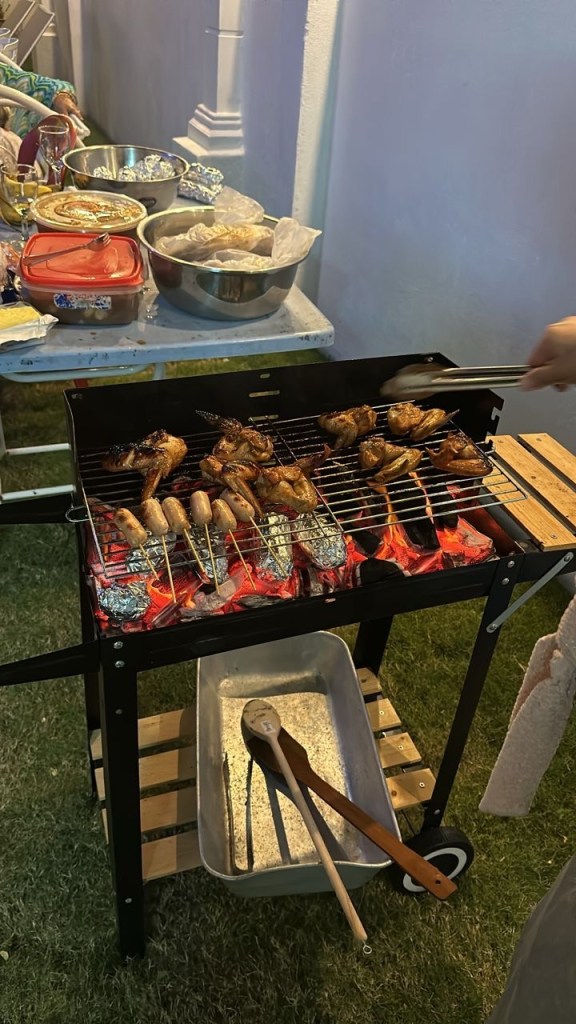 The barbecue grill was fired up, serving perfectly grilled lamb, chicken wings, sausages, and other flavorful treats. The aroma of sizzling food added to the excitement of the night. To complement the savory dishes, a beautifully arranged cheese platter stole the show. It was a delightful mix of cheeses, crackers, nuts, and fruits like cherries and grapes—a true indulgence for all. 🧀🍇🍒